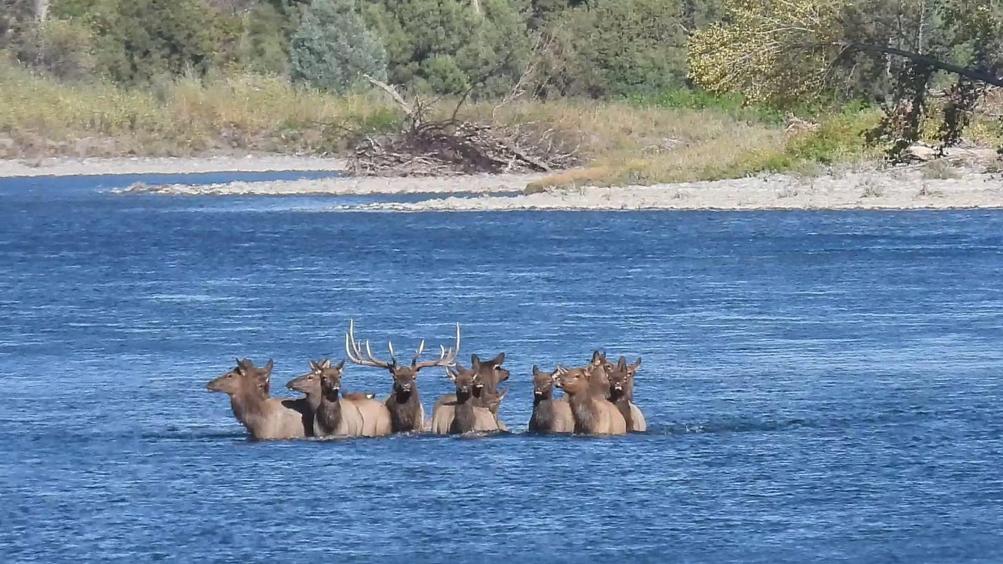 This victorious bull is crossing the Yellowstone River with his harem. At least a dozen cow elk surround him and they belong to him. He will breed them all.