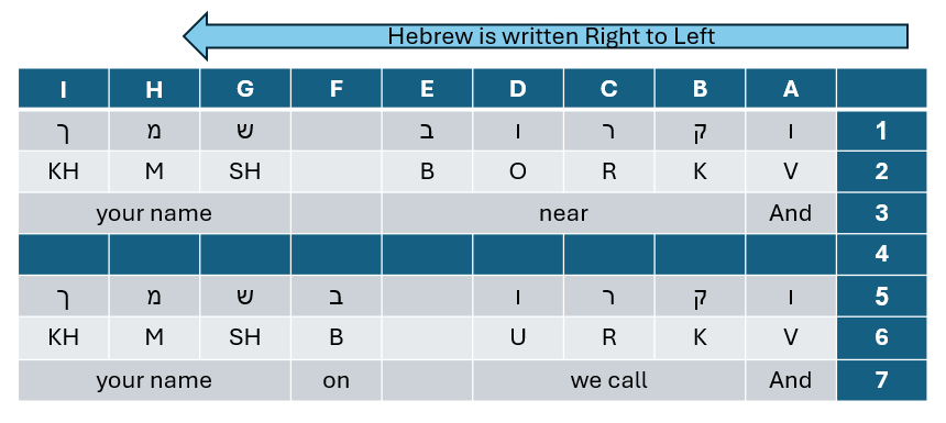 Hebrew is read right-to-left, so the columns are identified in that direction. Rows 1 and 5 are the Hebrew letters, with their English equivalents in rows 2 and 6. Recall that the Hebrew scriptures were originally written without most vowels and sketchy, if even existing, word spacing. Basically a bunch of consonants strung together.